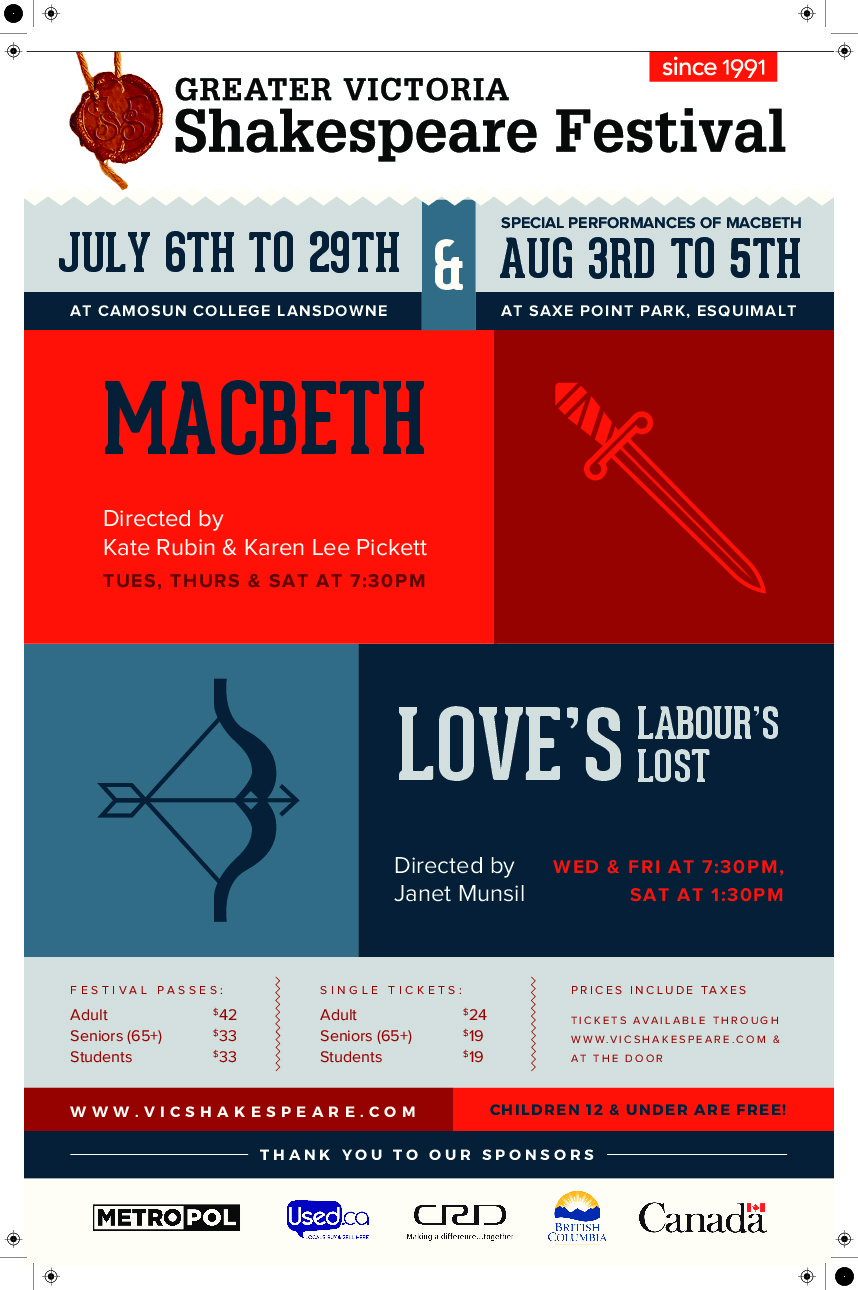 Come check out the Greater Victoria Shakespeare Festival, performing from July 6th-29th, outdoors on the grounds of Camosun College, Lansdowne Campus! The festival is family friendly, with children 12 and under being admitted for free! This year we are performing Macbeth!