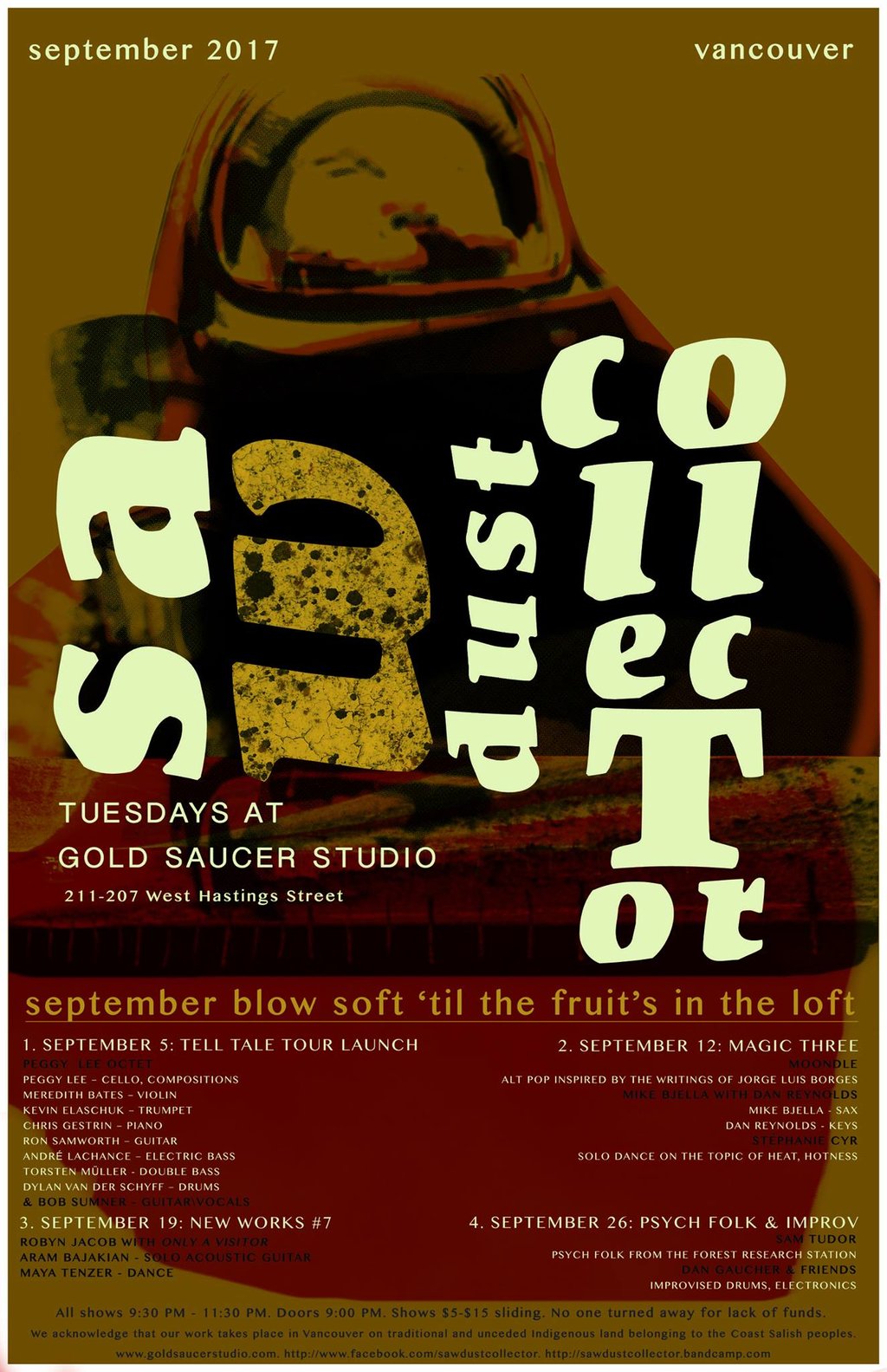 Sawdust Collector is a weekly concert series taking place on Tuesday nights at The Gold Saucer, curated by Barbara Adler, Cole Schmidt, James Meger and guests.