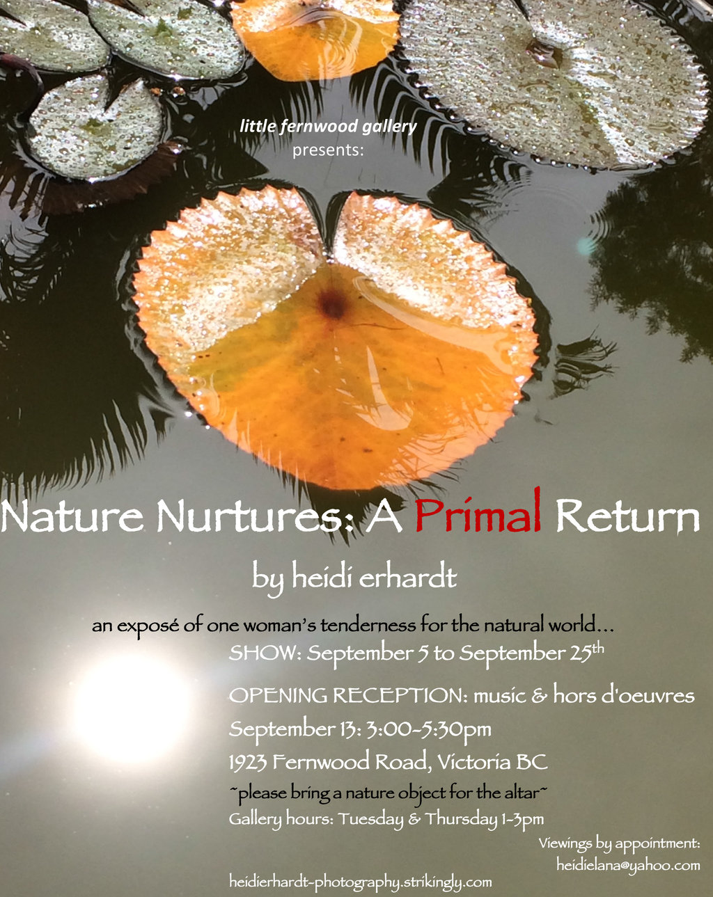 A gathering of community who appreciate nature, art and photography. Beautiful music and delectable treats to welcome you. We'll be doing an interactive communal art piece, so please bring a nature object to contribute! http://heidierhardt-photography.strikingly.com/