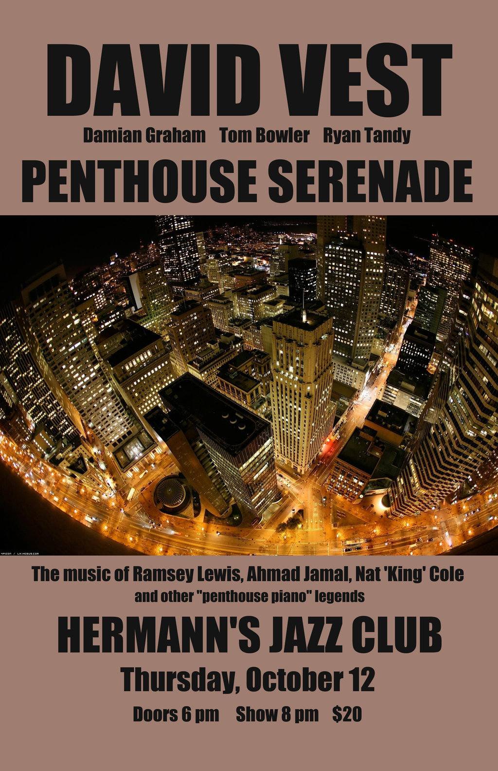 Join "The In Crowd" in a well-hidden skyscraper somewhere on "Route 66," while David and his band play the music of Ramsey Lewis, Ahmad Jamal, Nat 'King' Cole and other "penthouse piano" legends. The password is "Poinciana," and the skyscraper’s not really hidden, it’s right out in the open, but squares can't see it. Damian Graham on drums, Tom Bowler on guitar, Ryan Tandy on bass.