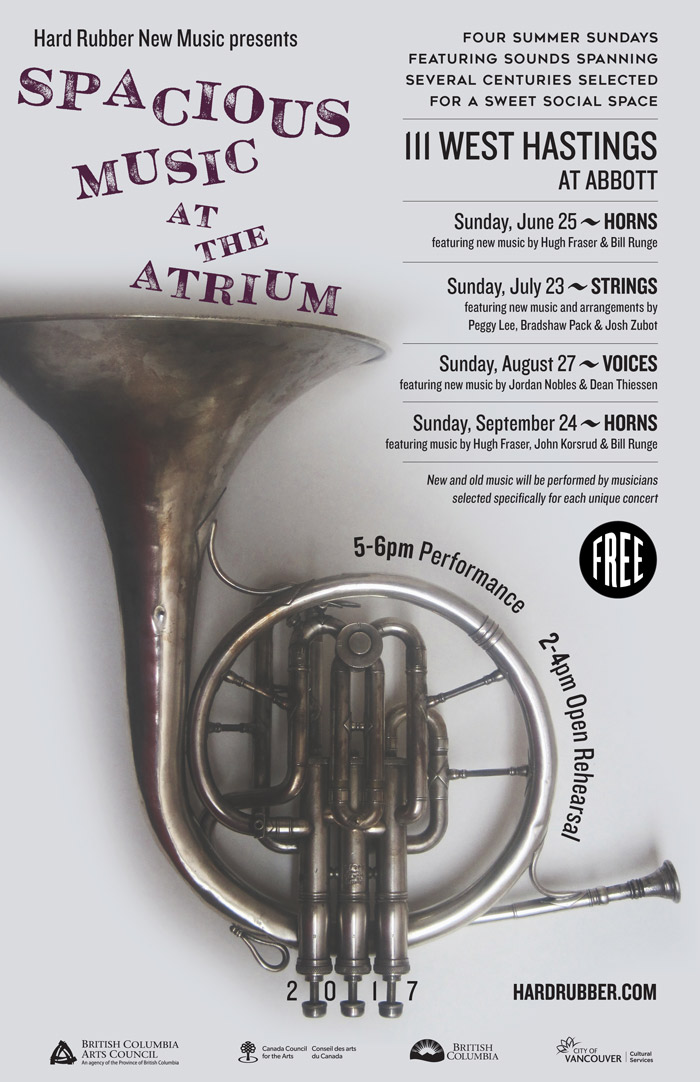 The Hard Rubber New Music Society presents Horns at the Atrium, the last of the series of free concerts featuring music selected and commissioned for the reverberant interior courtyard at Woodward’s (Hastings and Abbott) on four Sundays, June to September. Each program is dedicated to a particular instrument, held at 5 pm, preceded by an open rehearsal from 2-4 pm.