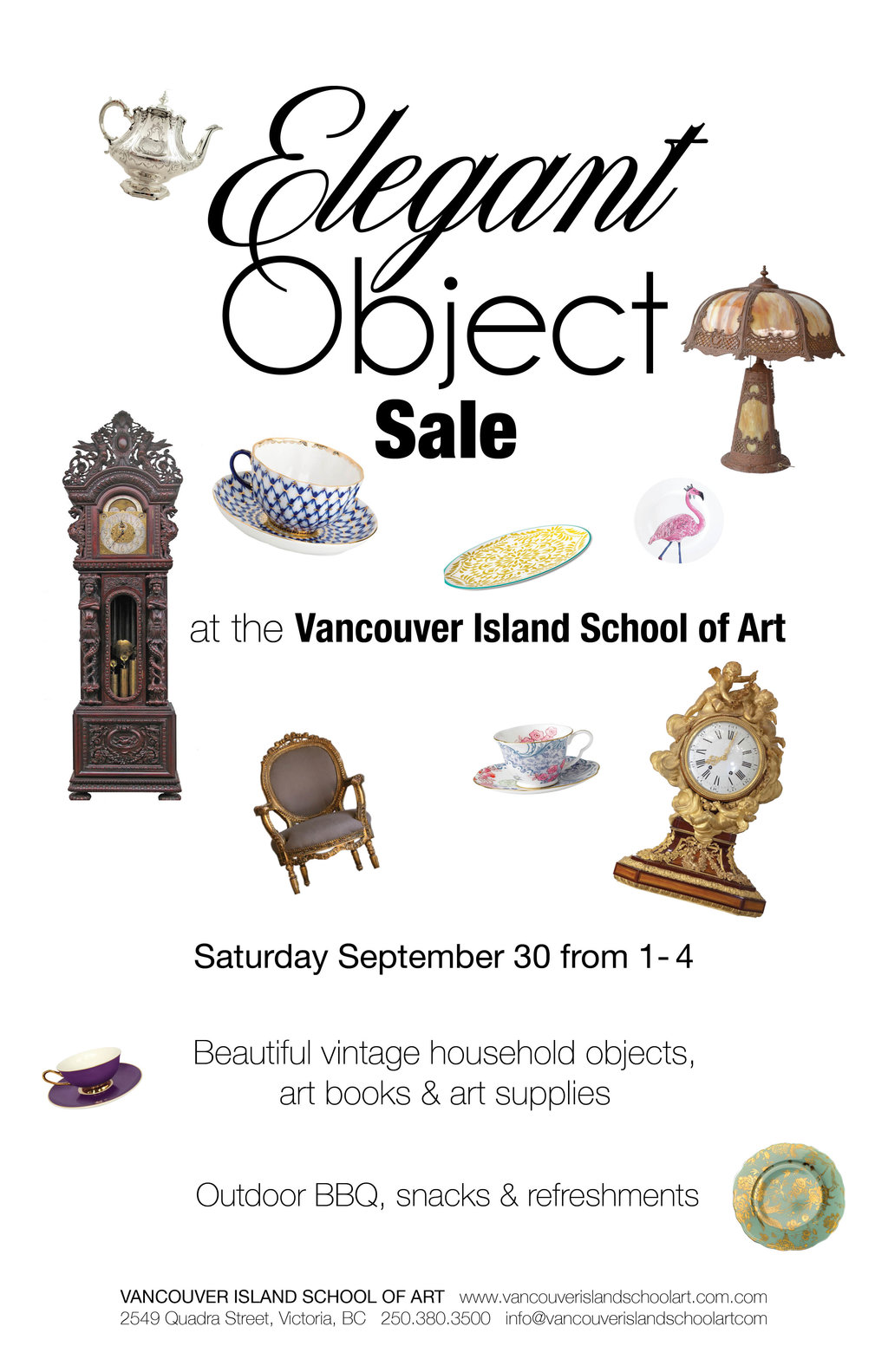 The Elegant Object Sale is a fundraiser for the Vancouver Island School of Art. We have collected donations of beautiful and elegant objects to be in our sale on Saturday, September 30 from 1-4pm. Come, browse and shop at the Vancouver Island School of Art! Items include delicate glassware, paintings, prints, teapots, small furnature items, lamps, figurines, metalware, decore, vases, doilies, and more!