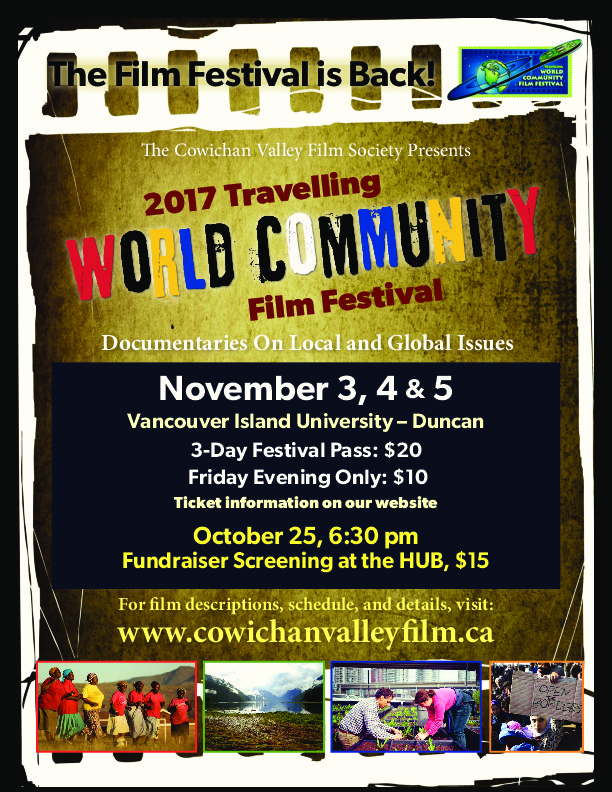 The Festival continues November 3-5 at VIU Cowichan Campus, screening 17 more documentaries, all shown in the Lecture Theatre. For film descriptions and information, visit our website, www.cowichanvalleyfilm.ca.