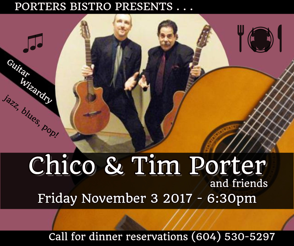 It's time to sit back and enjoy some truly great guitar playing featuring two of our favourite pickers! Chico, Tim and various friends show what the guitar is all about on Friday November 3. The music starts at 6:30pm - so relax and enjoy some of Porters reasonably priced Friday night entrees featuring pasta and schnitzel selections. Fully licensed, call for reservations: (604) 530-5297.
