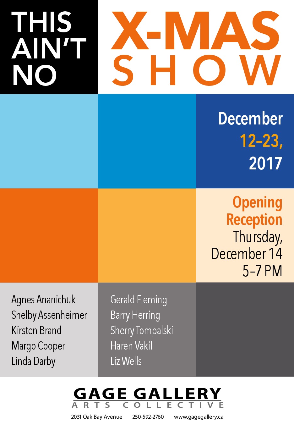 10 Gage Artists, each confined to the use of 2 colours and 9 square feet of wall space create inspirational paintings, collage and photography from a diverse range of subjects including the Rosetta Stone, Pierre Trudeau, the Italian Palio di Siena horse race, the psychological condition of Melancholia, the experience of free falling, imaginary spaces and transitions, as well as Venetian gondolas and Salt Spring dragon flies.