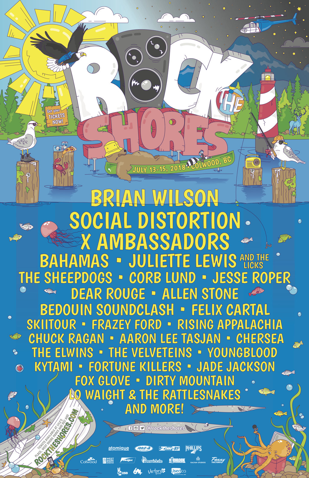 Rock The Shores: Brian Wilson , Social Distortion, X Ambassadors, Bahamas, Juliette Lewis and the Licks, The Sheepdogs, Dear Rouge, Allen Stone, Bedouin Soundclash, Felix Cartal, SkiiTour and , Frazey Ford, Rising Appalachia, Chuck Ragan, AARON LEE TASJAN, Chersea, The Elwins, The Velveteins, Youngblood, Kytami, Fortune Killers, Jade Jackson, Fox Glove, Dirty Mountain, Lo Waight & The Rattlesnakes