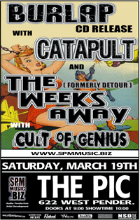 THE LONG AWAITED CD RELEASE FOR BURLAP...A NOT TO BE MISSED NIGHT..FRIENDS CATAPULT AND GUESTS THE WEEKS AWAY (FORMELY DETOUR)PLUS THE CULT OF GENIUS!!! YEOWW!!
