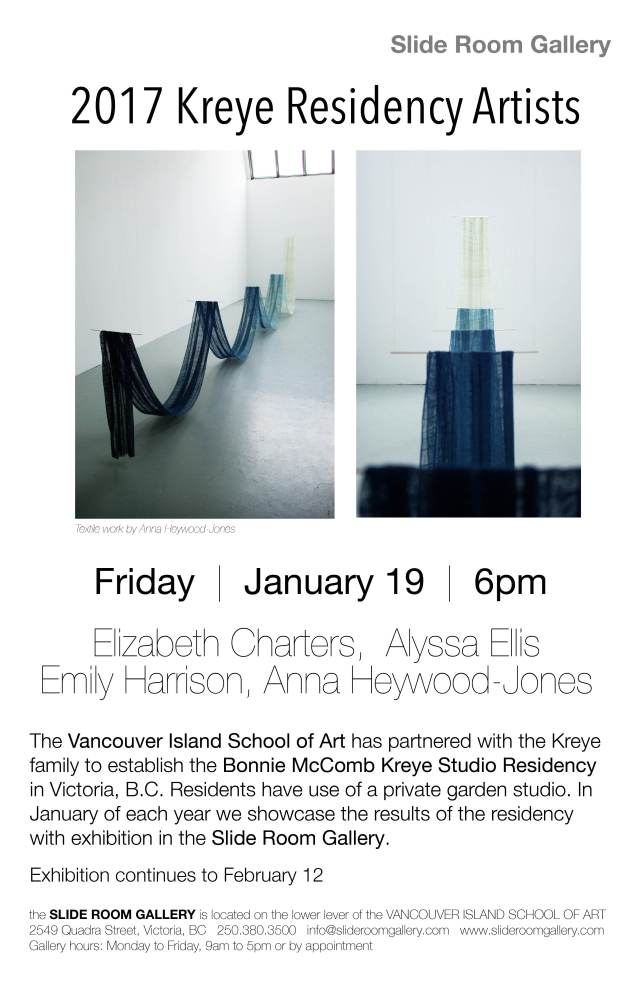 2017 Kreye Residency Artists: Elizabeth Charters , Alyssa Ellis , Emily Harrison , Anna Heywood-Jones @ Slide Room Gallery Jan 19 2018 - Feb 20th @ Slide Room Gallery