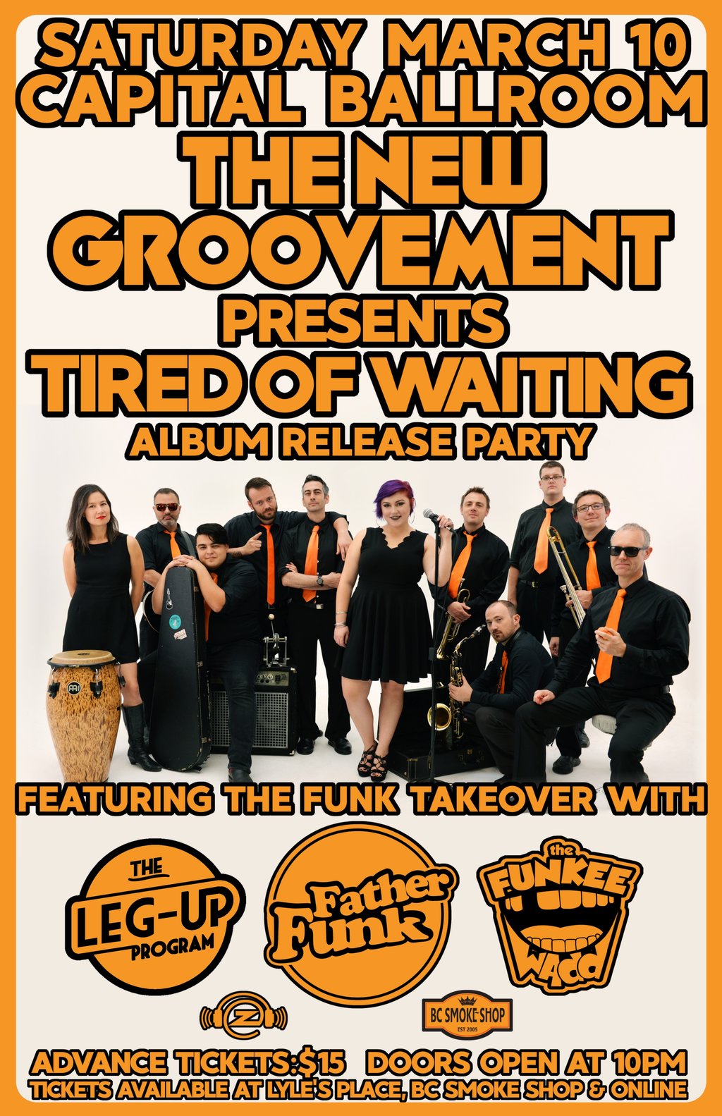 The New Groovement are thrilled to announce the release of our new 5 track EP, 'Tired of Waiting'. Featuring sultry singing, clever raps, vibrant horns, and the catchy, danceable sound that has become synonymous with The New Groovement, 'Tired of Waiting' is guaranteed to get you moving. To celebrate the release of this project, we are hosting a Funk Takeover at Capital Ballroom featuring some of the funkiest DJs from around the world and one of the only bands in town even bigger than we are! The 'Tired of Waiting' Album Release Funk Takeover is presented by The Zone at 91.3 with support from BC Smoke Shop.