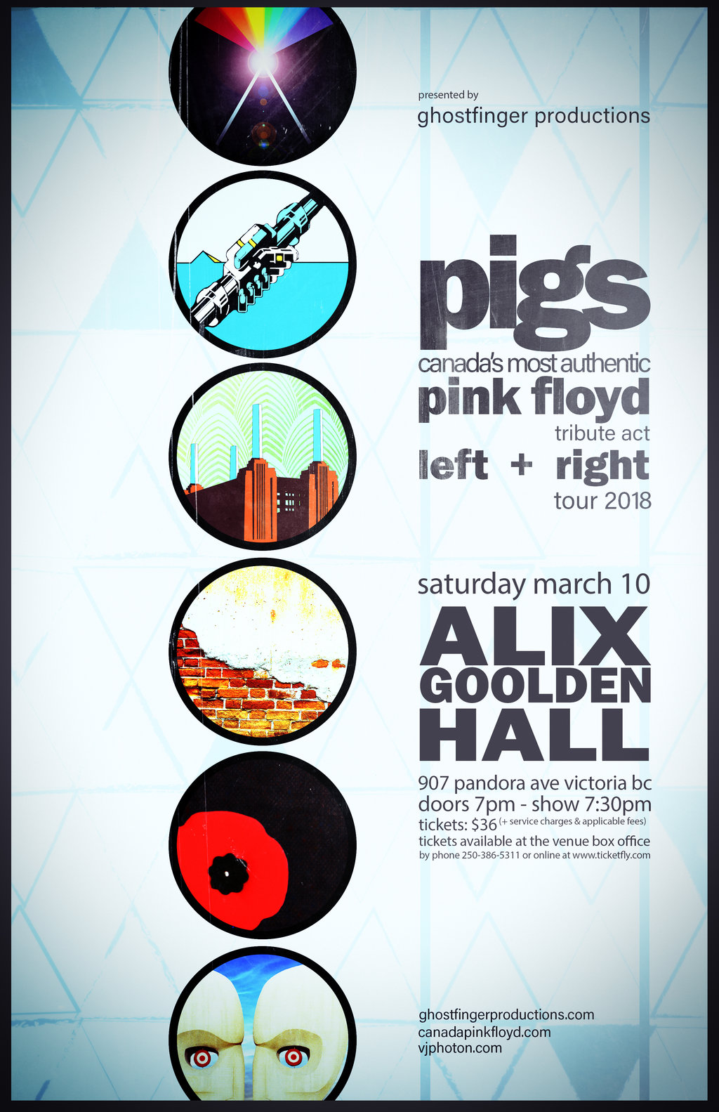 Formed in 2008 in Victoria, British Columbia, PIGS: Canada's Most Authentic Pink Floyd Tribute have spent ten years perfecting their craft in front of sold out audiences throughout Canada. On their Left + Right Canadian Tour, PIGS are bringing an epic and rare treat for Pink Floyd fans - the band will be performing selections from the entire Floyd catalog, including a few special surprises from Floyd solo records. In addition to classics from legendary albums like Dark Side Of The Moon, Wish You Were Here, Animals, and The Wall, the band will showcase material that has rarely—if ever—been performed live by Pink Floyd.