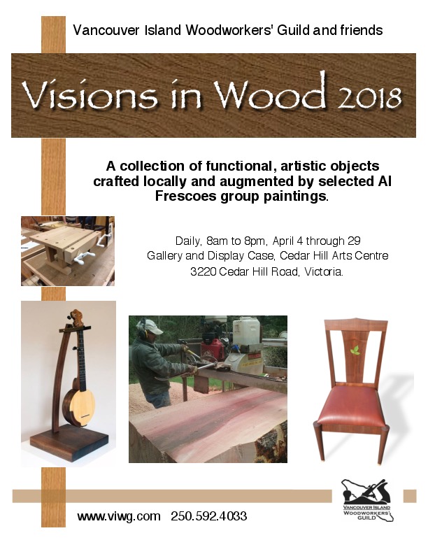 Visions in Wood 2018 is presented by the Vancouver Island Woodworkers Guild (a non profit group of 150 members). We present a collection of functional, artistic furniture and smaller objects crafted locally and augmented by selected Al Frescoes group paintings. Show Ambassadors will be on hand from 10am to 4pm each day to facilitate sales and answer questions. The Guild focuses on using local materials through our innovative wood recovery program and schools donation programs.