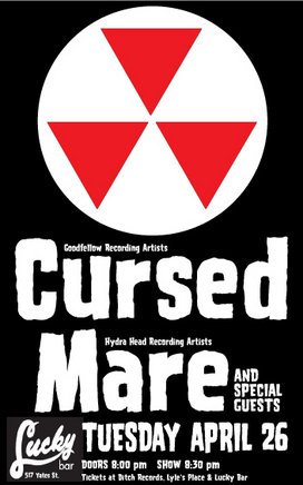 Goodfellow Recording Artists Cursed and Hydra Head Recording Artists bring their brand of Death n' Roll all the way from Ontario, with locals Hunting Humans. (www.your-funeral.com, www.mare.ca)