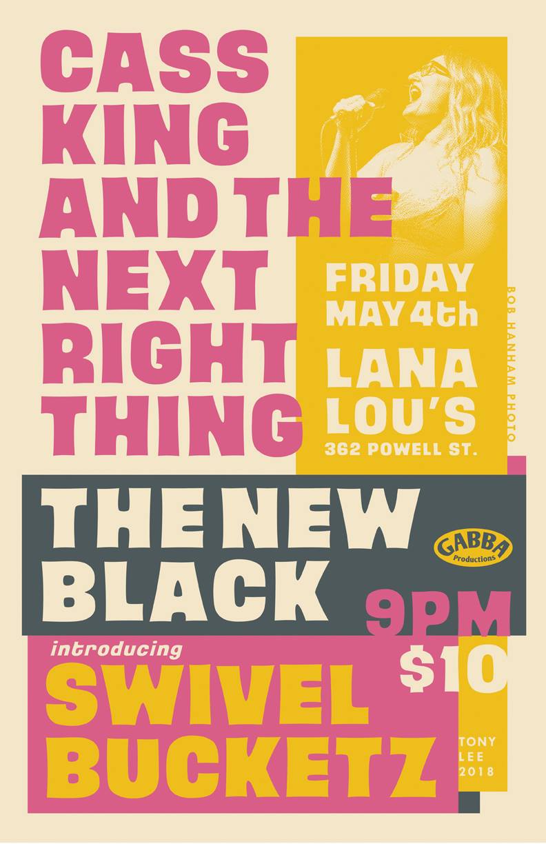 It's a fabulous Friday as Cass King & The Next Right Thing dole out a generous helping of Motown inspired, sultry garage soul rock. The New Black brings their classic punk-pop stylings and newly formed The Swivel Buckets, make their debut. There's Lana's tasty home-cut fries and just enough room for dancing!