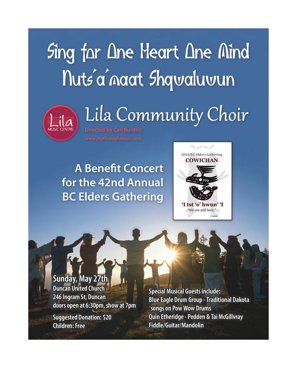 Sing for One Heart One Mind Nuts’a’maat shqwaluwun: Lila Music Community Choir , Blue Eagle Drum Group, Cari Burdett, Quin Etheridge-Pedden, Tai McGillivray  @ Duncan United Church May 27 2018 - Feb 11th @ Duncan United Church