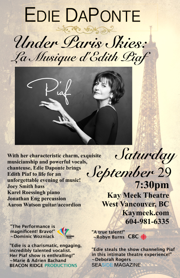 Channelling Piaf, with her rich timbre and captivating stage presence, Edie aims for a completely authentic experience and her experienced band helps create the atmosphere of an intimate Parisian theatre. Joining Edie are long-time collaborator Joey Smith on bass, and Vancouver Island favourites Karel Roessingh on piano, Jonathan Eng on drums and filling the important role of accordionist, Aaron Watson. These talented musicians all have long careers in the B.C. jazz scene.