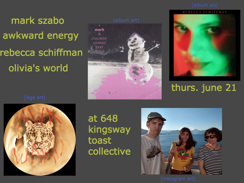jack lewis's awkward energy and rebecca schiffman are on tour! come to the toast to support them, and to welcome musician mark szabo back to the world of playing live shows. also come to meet n greet locals "olivia's world"!