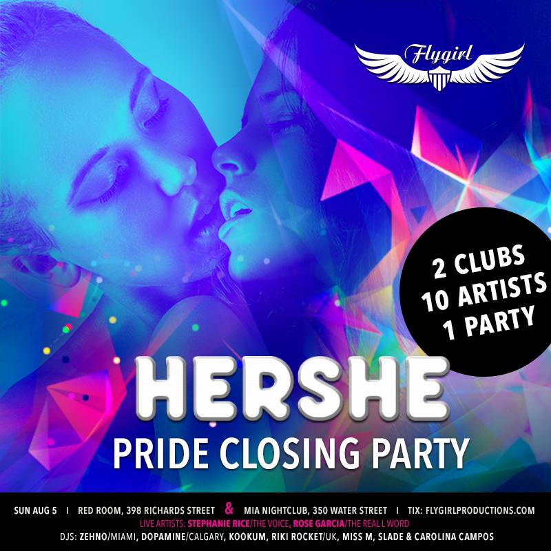 The mother of all Pride parties – 10 DJs, 2 clubs, 1 indoor festival! HERSHE is so big it transforms two clubs (steps from each other) into one giant party—and might just spill out into the streets with food trucks. Two dancefloors, two thundering sound systems, lights, lasers, jets of confetti and world-rocking DJs in both venues. For 2018, we're welcoming Stephanie Rice from The Voice, Rose Garcia from The Real L Word, and a bevy of international and local DJs: Zehno(Miami), Dopamine(Calgary), Kookum(Vancity), Riki Rocket(UK), Miss M(Dinah), Slade(Queer as Funk) & Carolina Campos(Vancity) to name a few. One ticket gets you into both Pride-pumping venues.