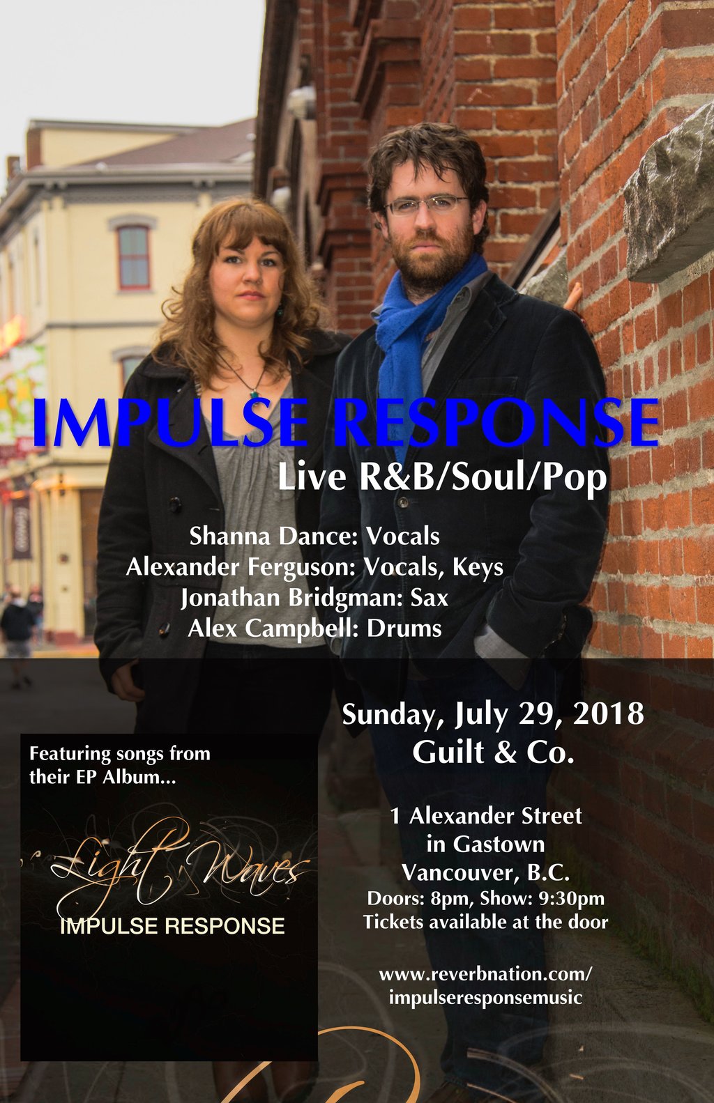 Impulse Response is a soul, groove, and R&B quartet from Victoria, BC. Shanna and Alexander front the band as lead vocalists and will be joined by Alex Campbell on drums and saxophonist, Jonnie Bridgman, for their 4th annual tour of the Okanagan and Mainland this summer. With tight and punchy grooves, their sound is infused with sweet and soulful harmonies.