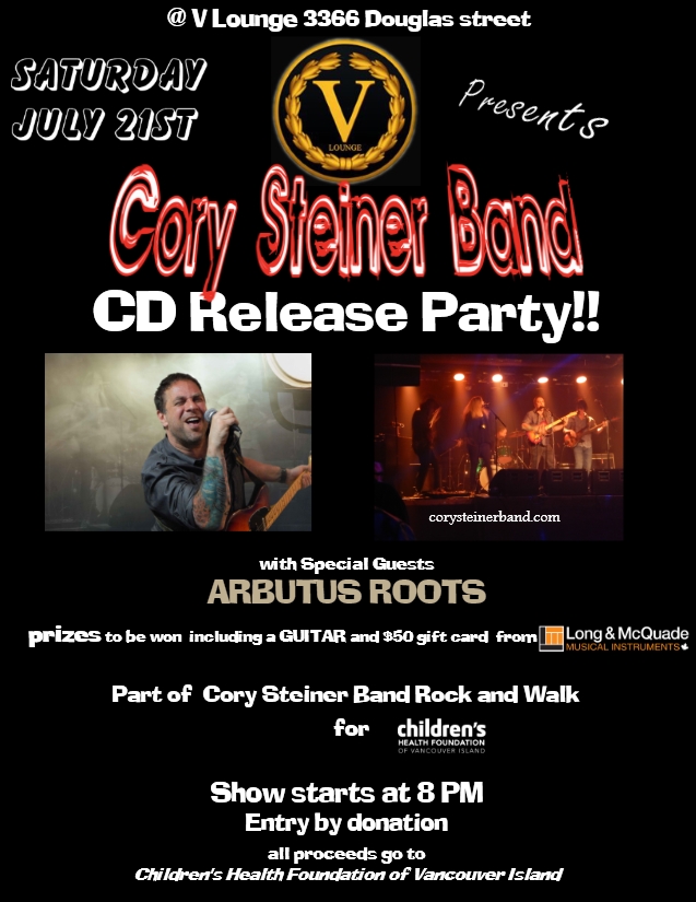 Come out and celebrate the release of our debut self-titled album, Cory Steiner Band. We will be rocking the stage with help from our special guests Arbutus Roots who are opening the show. The show starts at 8 pm. Entry is by donation. All proceeds go to Children's Health Foundation of Vancouver Island as part of the Cory Steiner Band Rock and Walk for Children's Health Foundation of Vancouver Island event.