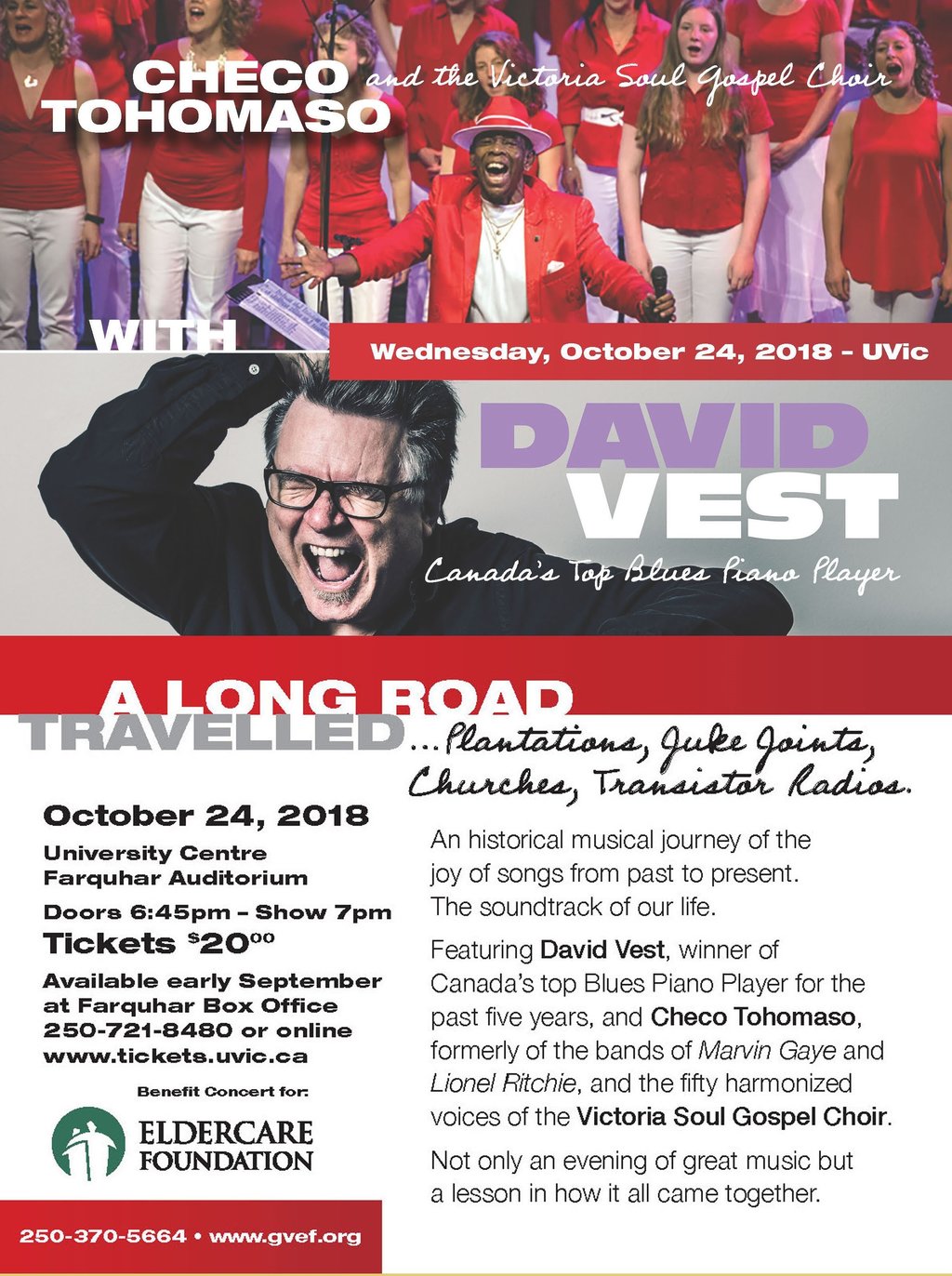 Not only an evening of great music, but a lesson in how it all came together! Featuring Canada’s top Blues pianist David Vest with Checo Tohomaso and the 50 harmonized voices of the Victoria Soul Gospel Choir. Proceeds support the Eldercare Foundation Music Therapy Programs.