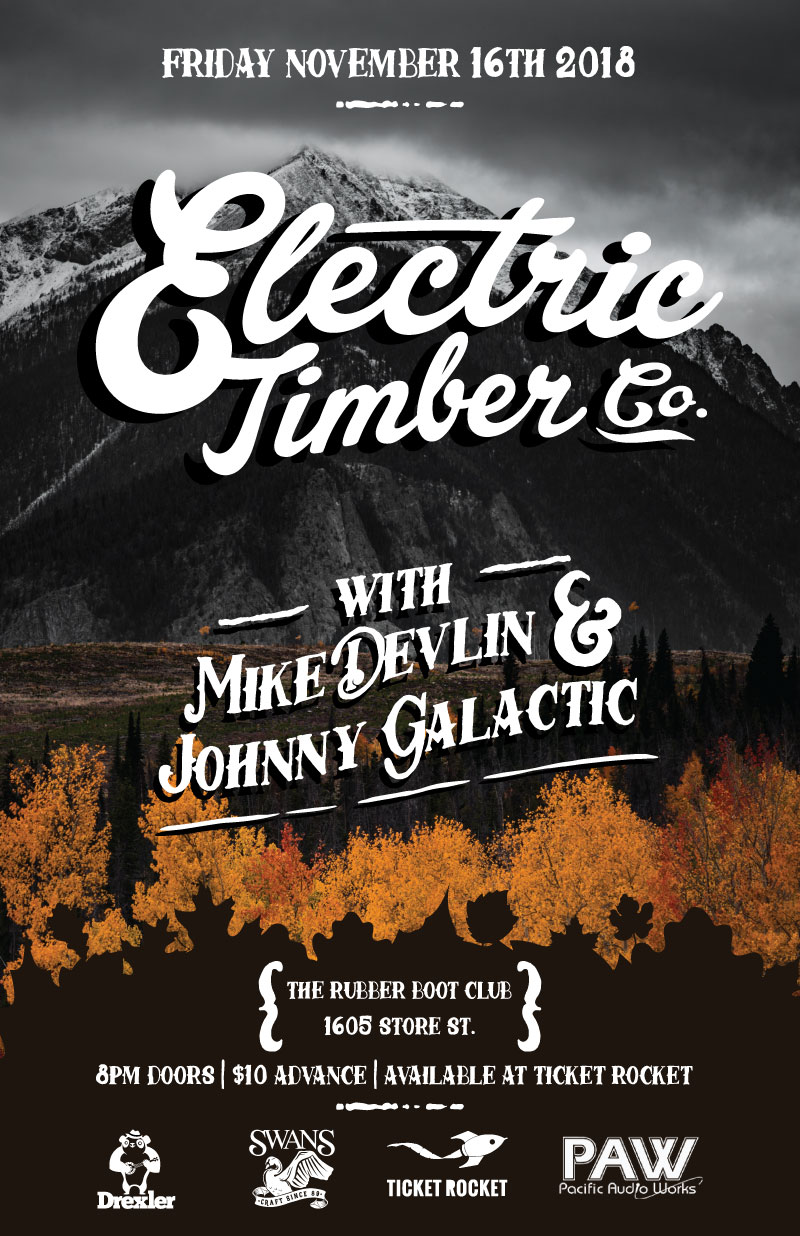 If horse racing were to be a night time event, this would be it. Come escape a dark November night with your pals, The Electric Timber Co, Mike Devlin, and the handsome(s) Johnny Galactic. Tickets are only $10 advance available at Ticket Rocket. Doors are at 8. Fun starts at 8:01
