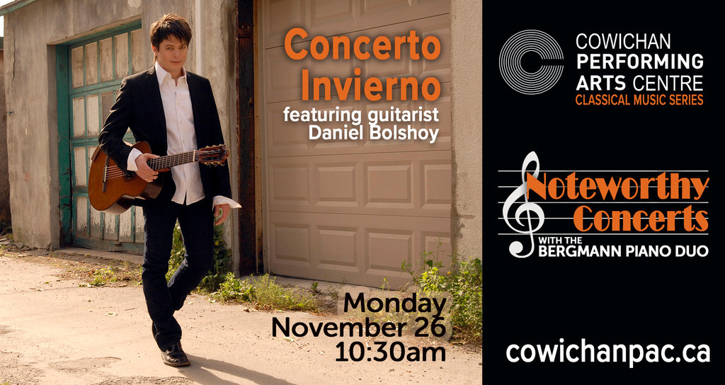 Virtuoso guitarist, Daniel Bolshoy joins the Bergmann Piano Duo in the second installment of our Noteworthy Classical Concert Series. This classical music programme is sure to warm you up with pieces such as Invierno Porteño by Astor Piazzolla, the famous Concierto de Aranjuez by Joaquin Rodrigo and works from Vivaldi, Granados and Boccherini.
