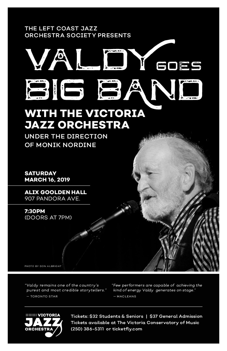 Mark it on your calendar! Join us for an evening of Valdy’s hits with Vancouver island’s most acclaimed big band. Don’t miss the fun with the Victoria Jazz Orchestra for this memorable Victoria big band concert premier featuring favourites performed by folk legend Valdy not-to-be-missed — see you there!