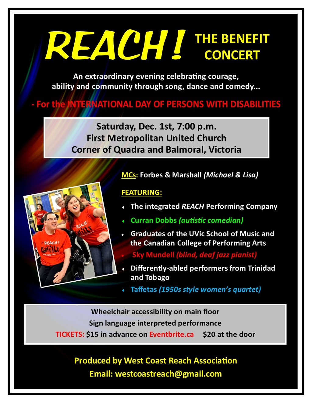 On Saturday, December 1st, Victoria residents can experience something virtually guaranteed to uplift and inspire. “REACH – The Benefit Concert” features a host of extraordinary “abled” and “differently-abled” performers in recognition of the International Day of Persons With Disabilities. “This will be an extraordinary evening celebrating courage, ability and community” says organizer Anne-Marie Brimacombe “with outstanding song, dance, spoken word and comedy numbers”.