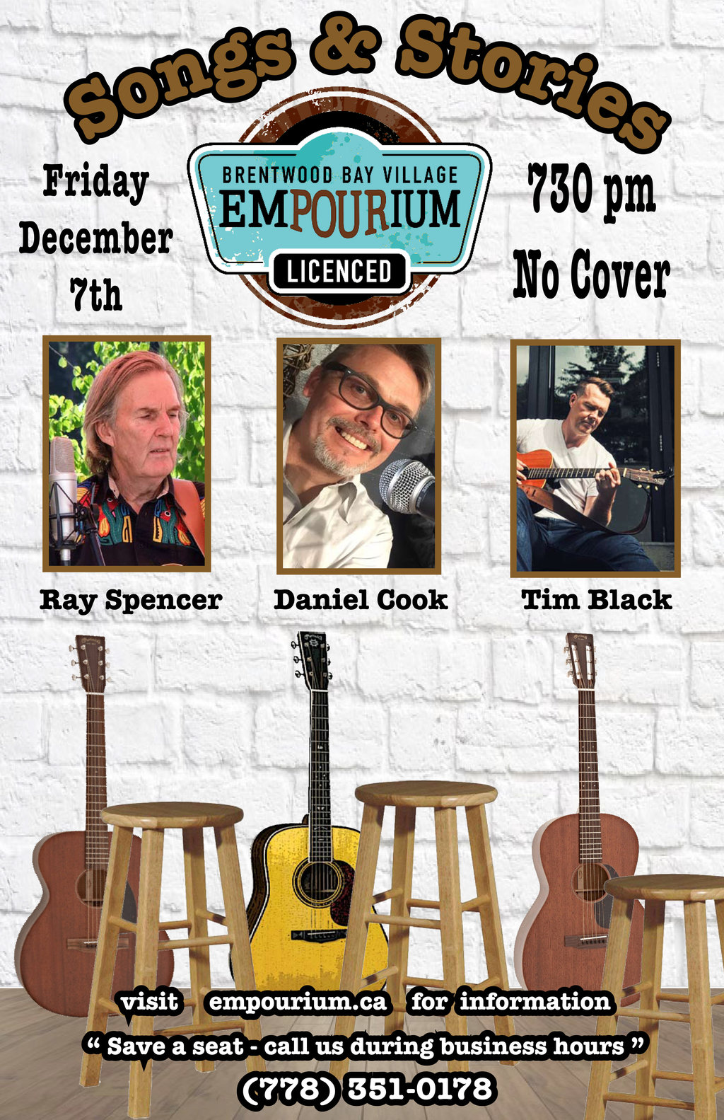 Songs and Stories features 3 local songwriters who have put together a ' BlueBird Cafe ' style evening featuring songs from past albums and new pieces being heard for the first time. Ray Spencer, Daniel Cook and Tim Black will introduce original music and add in instrumentation and some sweet harmonies to each others songs as they play.