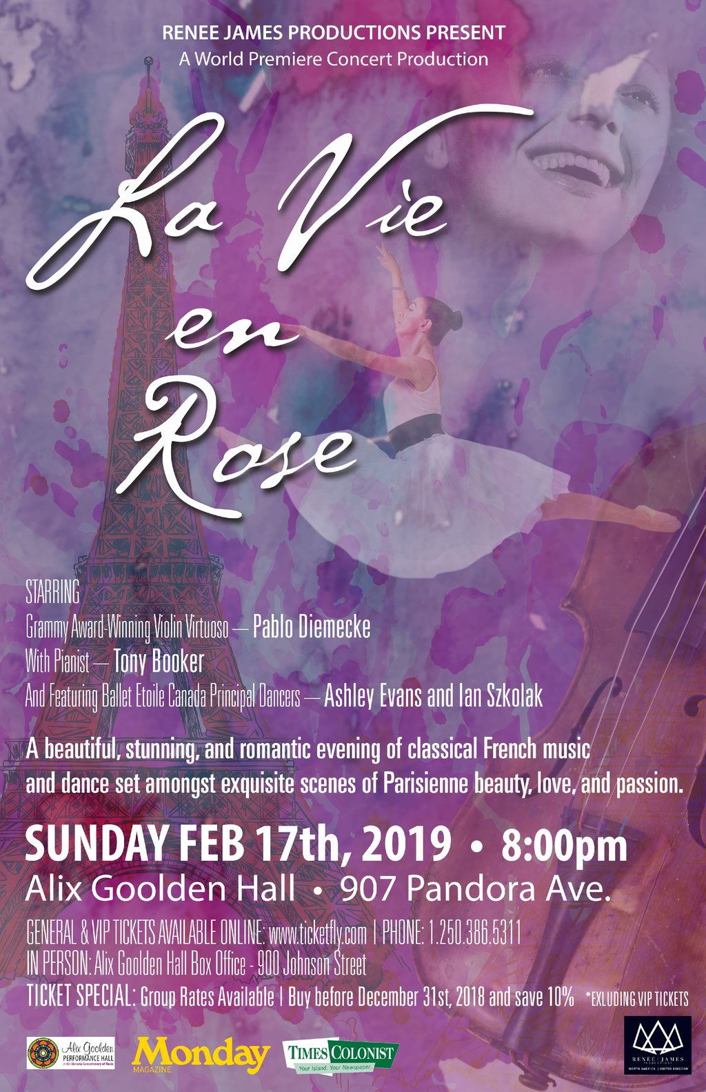 IN BRIEF: Under the creative direction of UK/Canada based Renee James Productions comes a romantic and intimate classical concert set among exquisite scenes of Parisienne beauty, love, and passion. La Vie en Rose blends together some of the most celebrated French music ever composed accompanied by breathtaking choreography and rich vocals.