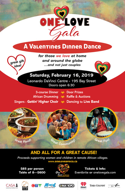 Join us for a gala Valentines celebration (and not just couples) for those we love at home and around the globe. Be greeted with a complimentary champagne punch and African drumming, enjoy a 3-course dinner, silent/live auctions, raffles and door prizes, featuring a musical celebration by the Gettin' Higher choir. It's then time to rock it out on the dance floor to a live dance band (“Wicked Ways”) with top hits from the decades. All proceeds supporting remote village women and children in East Africa, the gift that keeps on giving. Please join us! For tickets just check www.onelovegala.com or Eventbrite (OneLove Valentines Dinner Dance Gala).