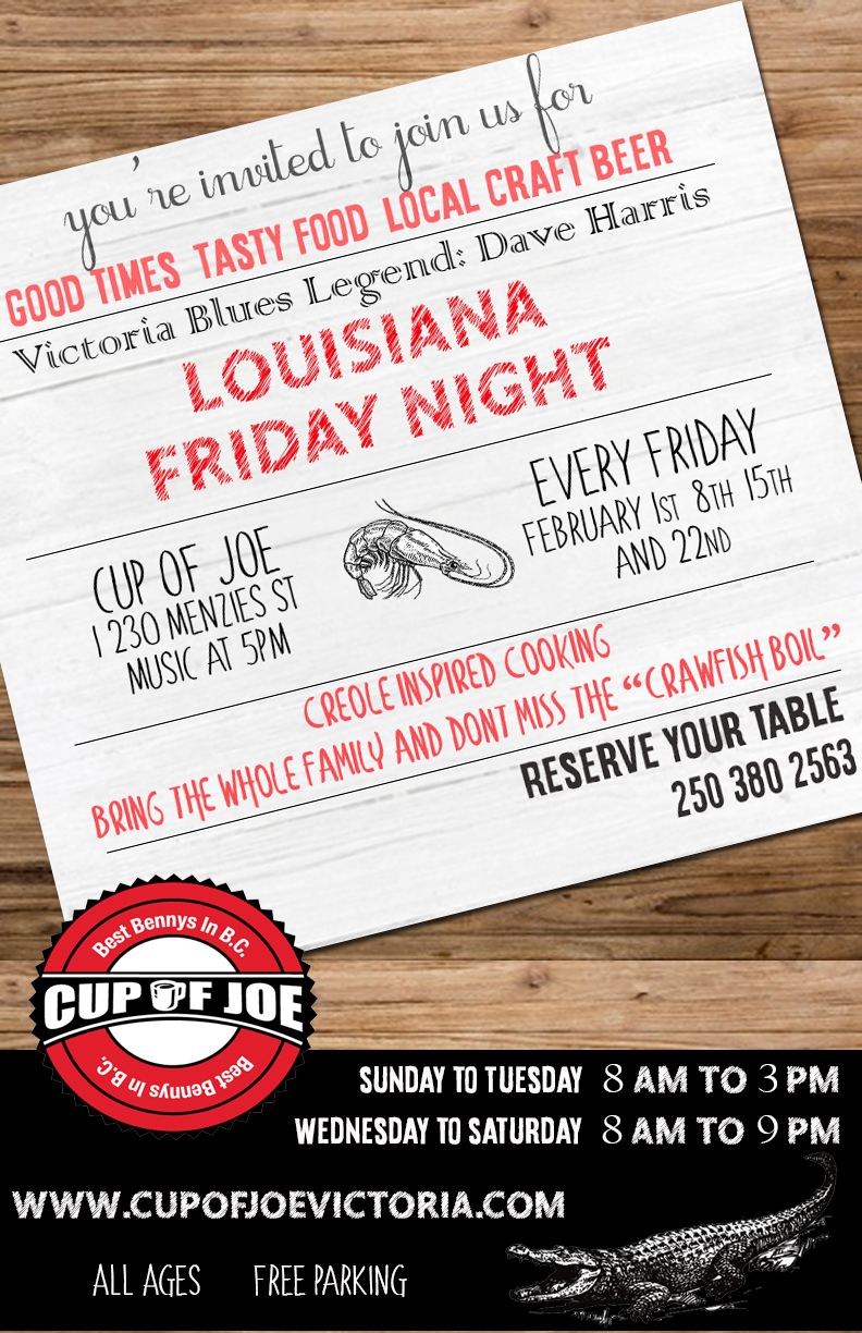 Join us every Friday night in February for our Louisiana Friday Night! Victoria blues legend, Dave Harris, will get your feet stompin' and Creole inspired dishes will heat you up for a legendary evening of family friendly fun. ~Tasty Food~Local Draught~BCVQA Wine~Delta Blues~