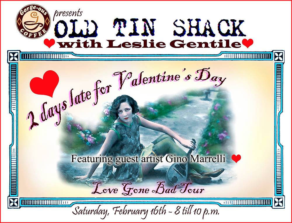 Join Old Tin Shack on their Love Gone Bad tour, two days after Valentine's day! Russ Godfrey on guitar, Derek Walsh on harmonica, and Rick Van Krugel on mandolin. Leslie Gentile joins on vocals + Gorge-ous Coffee's co-owner Gino Marrelli opens with Italian love songs!