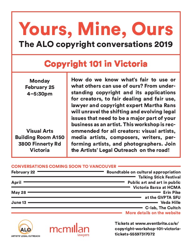 How do we know what’s fair to use or what others can use of ours? From understanding copyright and its applications for creators to fair dealing and fair use, lawyer and copyright expert Martha Rans will unravel the shifting and evolving legal issues that need to be a major part of your business as an artist. This workshop is recommended for all creators: visual artists, media artists, composers, writers, performing artists, and photographers. Join the Artists’ Legal Outreach on the road!