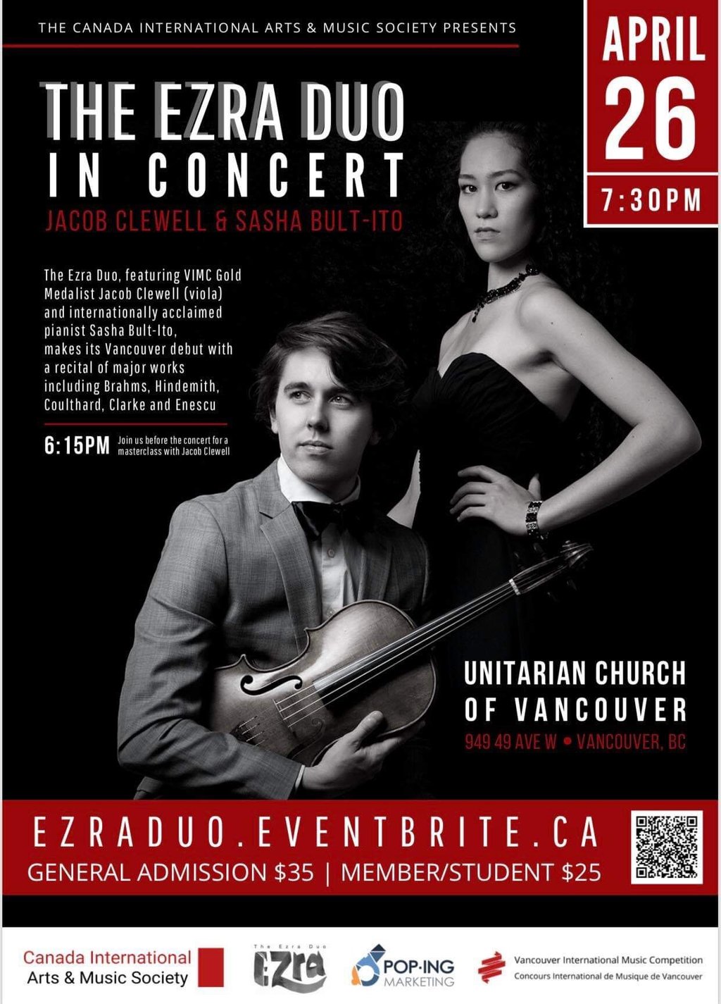 The Canada International Arts and Music Society is pleased to present award winning viola and piano duo, The Ezra Duo in concert.