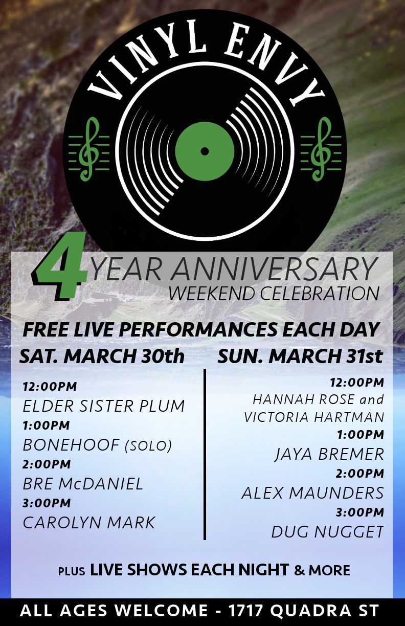 Join us in celebrating with FREE live performances from local musicians for Vinyl Envy's 4 YEAR ANNIVERSARY -