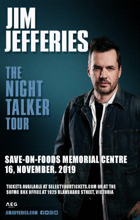 Tickets for Jim Jefferies live in Victoria will go on sale Friday, March 29 via the Save-On-Foods Memorial Centre box office and SelectYourTickets.com. Tickets are C$39.50 and C$59.50.