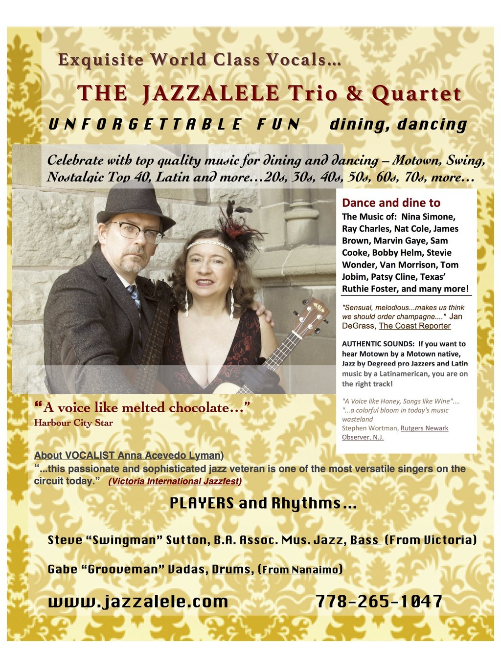 You'll fall in love with your favourite songs all over again! The Jazzalele Duo will perform Ray Charles, Nina Simone, Jazz and NOSTALGIC top 40. You'll also hear Motown from a Motown native, and some Bossa Nova from one who has family in Brazil. Exquisite World Class Vocals and rhythms, with Anna Acevedo Lyman on vocals and stringed instruments, and Steve "Swingman" Sutton on Bass. No cover charge