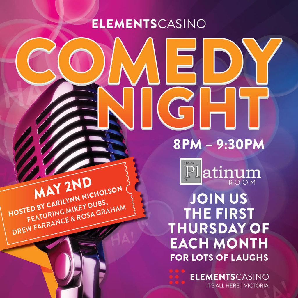 Get ready for some laughs because comedy night is coming back to Elements Casino Victoria! On May 2, experience the provocative stand-up of Carilynn Nicholson and Victoria’s own Drew Farrance, Rosa Graham, & Mikey Dubs. Guests are invited to experience these comedians free of charge. The event will also include a cash bar, concession food, and $5 Molson Canadian lagers!