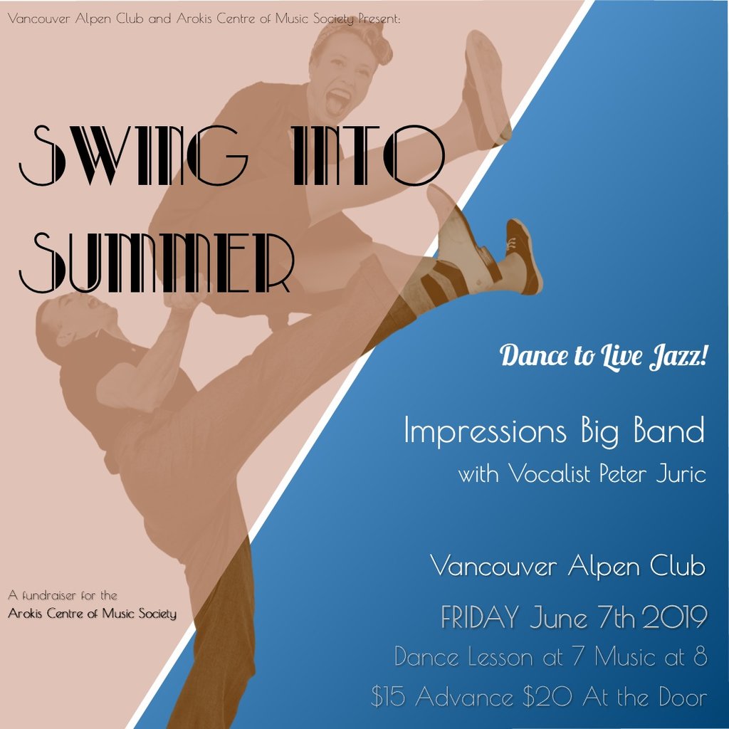 Kick off the summer with another swinging dance at the Alpen Club, featuring the Impressions Big Band with vocalist Peter Juric. The band will offer a great selection of tunes from Swing Era dance band greats like Artie Shaw, Glenn Miller, Count Basie, Duke Ellington, and Benny Goodman. We’ll also have Latin favorites, contemporary pop tunes, and recent additions to our Ray Charles repertoire. Before the music starts, dance instructor extraordinaire Maria Morlin will lead a lively one-hour lesson that focuses on the spirit of swing dance style Lindy-Hop.