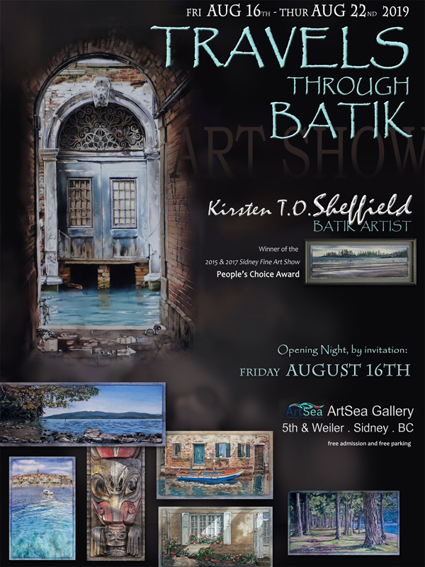 Painted Batik Artist, Kirsten T.O. Sheffield returns to the Sidney waterfront with her solo show entitled "Travels Through Batik - At Home and Abroad." Kirsten subtly manipulates wax and dye to marry realism and the fluid nature of water within her colourful painted batiks and for a week, the ArtSea Gallery will inspire visitors with a combination of local, Westcoast images, as well as paintings from France, Croatia and the luminous canals of Venice! Originals, as well as a selection of limited edition giclées, will be available and a display of her studio table will give a glimpse of her creative process. Kirsten has exhibited at the Sidney Fine Art Show since 2013, winning the 2015 and 2017 People's Choice Awards.