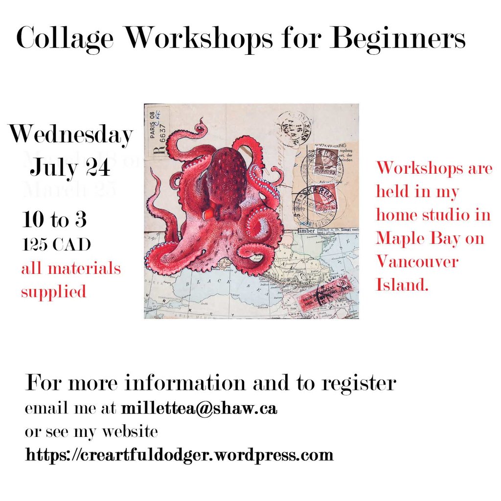 Collage Workshop for Beginners in my home studio in Maple Bay. I am a professional teacher and experienced art instructor. Come out and play in the studio. No previous experience or art skills needed.You learn all the basic techniques of collage and complete two small collages to take home. I provide all tools and supplies and written instructions for you to take home. This is a well organized fun and easy full day workshop. Cost is $125. To register please email.