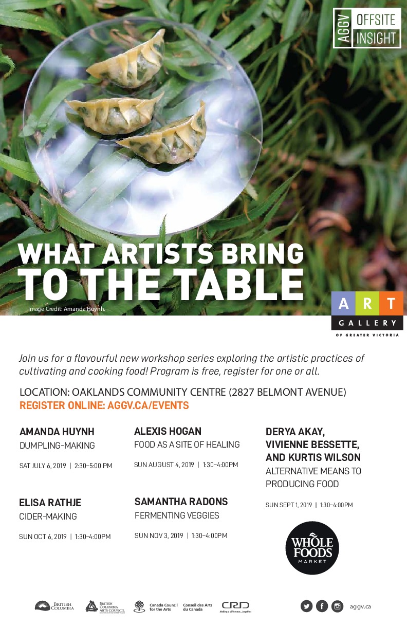 Running from July to November, What Artists Bring to the Table is a food series exploring the artistic practices of cultivating and cooking food. The series central theme is how food is both a political act, as through eating we are supporting different systems, and a cultural act, which can both reaffirm one’s own identity, but also assist us to see other’s worldviews. Each event will feature two components: a hands-on workshop, where participants will work with the artist to make a food product, and a discussion, where participants will have a larger conversation about food while sampling the food from the workshop.