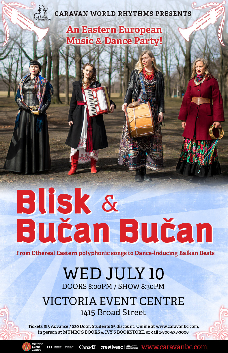 Join us for a musical voyage across Eastern Europe, featuring the polyphonic all-female quartet Blisk from Toronto, and followed by the Balkan party band from Victoria Bucan Bucan.