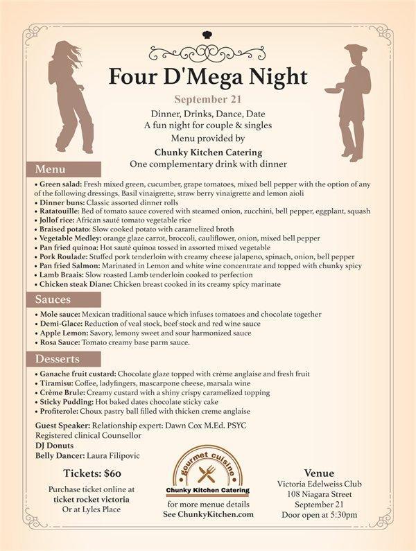 Four D Night. Great Night of fun for couples and singles. Night of Dinner, Dance, Drinks Date and a great experience to hear a relationship expert speak. A night to see a live belly dancer perform. Dance to our DJ and enjoy the exquisite meal catered by Chunky Kitchen Catering.