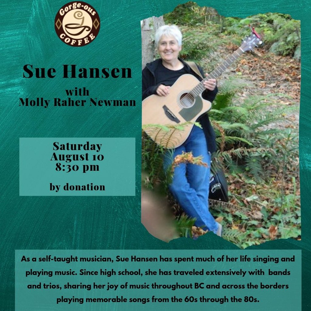 As a self-taught musician, Sue Hansen has spent much of her life singing and playing music. Born and raised in Vancouver, out of high school, she created and traveled extensively with bands and trios, sharing her joy of music with audiences throughout BC and periodically across the borders. Sue has lately performed with simpler expression as a soloist, playing memorable songs from the 60s through the 80s, in more intimate venues around home in beautiful Victoria.