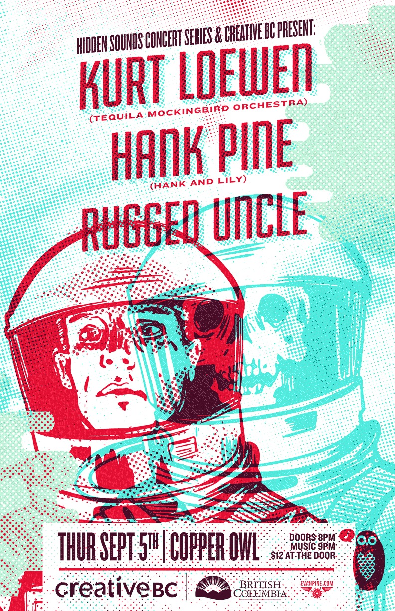 You are invited to join us on a musical journey through time and space featuring Kurt Loewen (Tequila Mockingbird Orchestra), Hank Pine (Hank & Lily) and Rugged Uncle. Expect an evening of folk, rock & roll, hip hop, indie rock and more! Graciously supported by Creative BC and presented by the Copper Owl Hidden Sounds Concert Series.