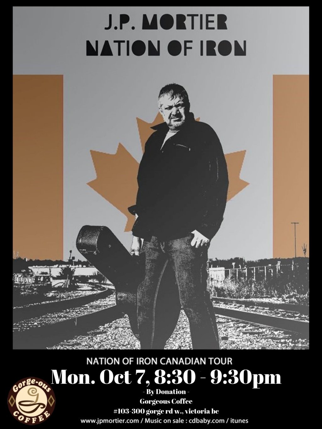Singer song writer, J.P. Mortier brings his intense acoustic guitar and passionate vocals to Victoria on his "Nation of Iron Canadian Tour".