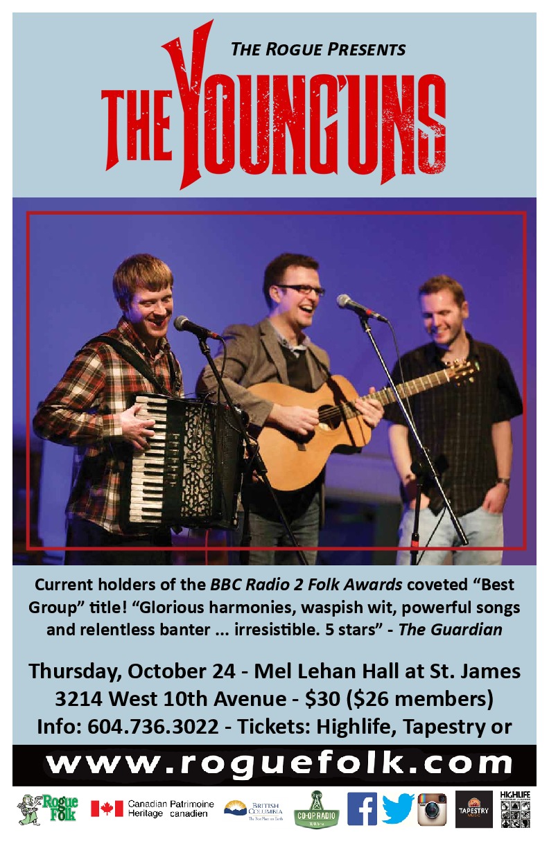 Teesside's triumphant trio The Young'uns are renowned for their pitch perfect harmonies and rapid fire humour, their live show undeniably has the human touch. Their subtly accompanied self written songs tell it how it is alongside traditional songs from their native North- East England and further afield - songs of conscience, songs of warmth and wit, songs to provoke, songs to inspire. They are an act that truly takes the cliché out of the "make you laugh, make you cry" tag.