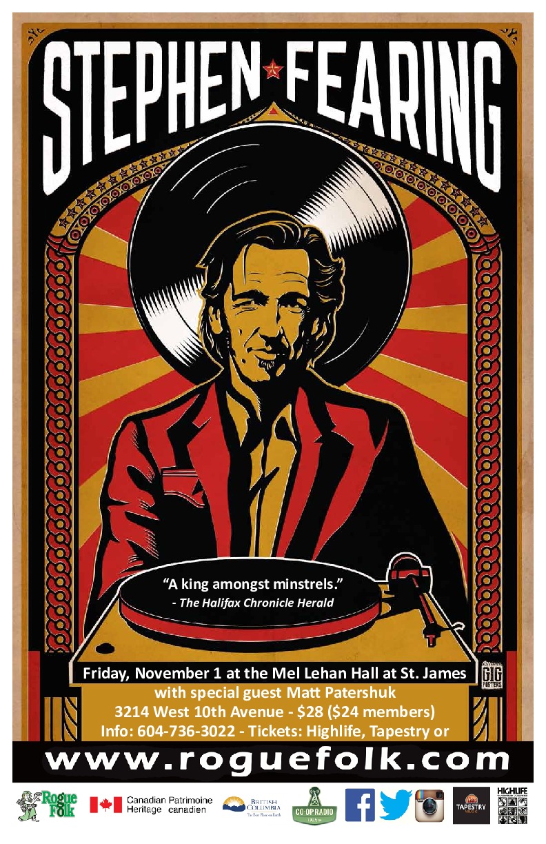 By 1984 he was back in Vancouver, determined to become a professional musician. He's been named as one of the finest songwriters in Canada following a life of many relocations and countless months on the road performing at intimate venues and on the concert stages of festivals and theatres across Canada, the US, and the UK. Fearing is a gifted storyteller and true musical nomad with the ability to captivate audiences of all sizes.